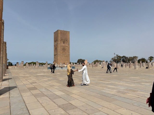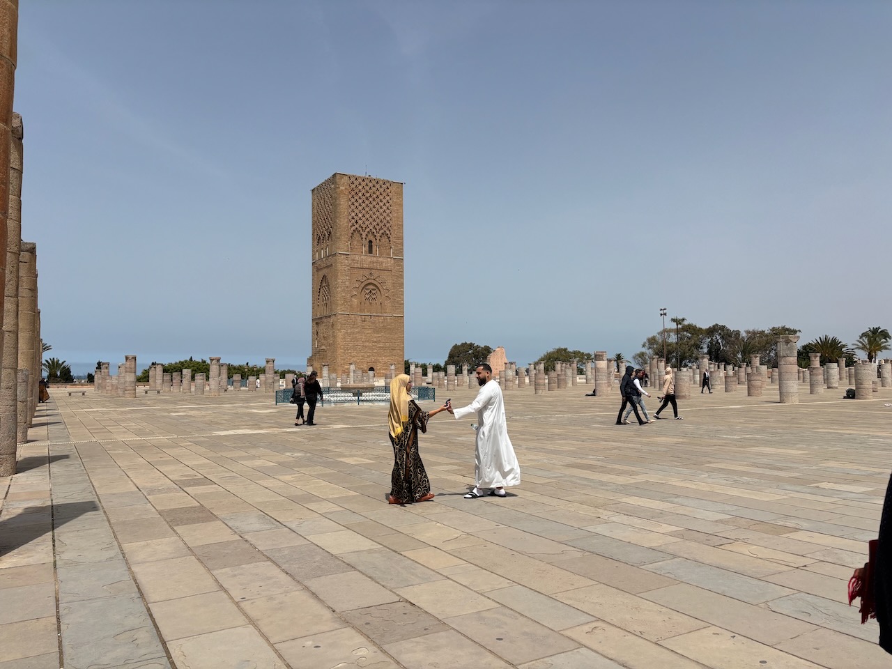 We weren’t all that interested in going inside the Mausoleum and so just spent some time at the edge of the esplanade, viewing folks streaming in for the call to prayer, as they threaded their way through the remaining columns of the incomplete mosque that was commissioned near the end of the 12th century. At the other edge of the esplanade is the Hassan Tower, commissioned by Abu Yusuf Yaqub al-Mansur, the third caliph of the Almohad Caliphate, at the same time as the mosque.