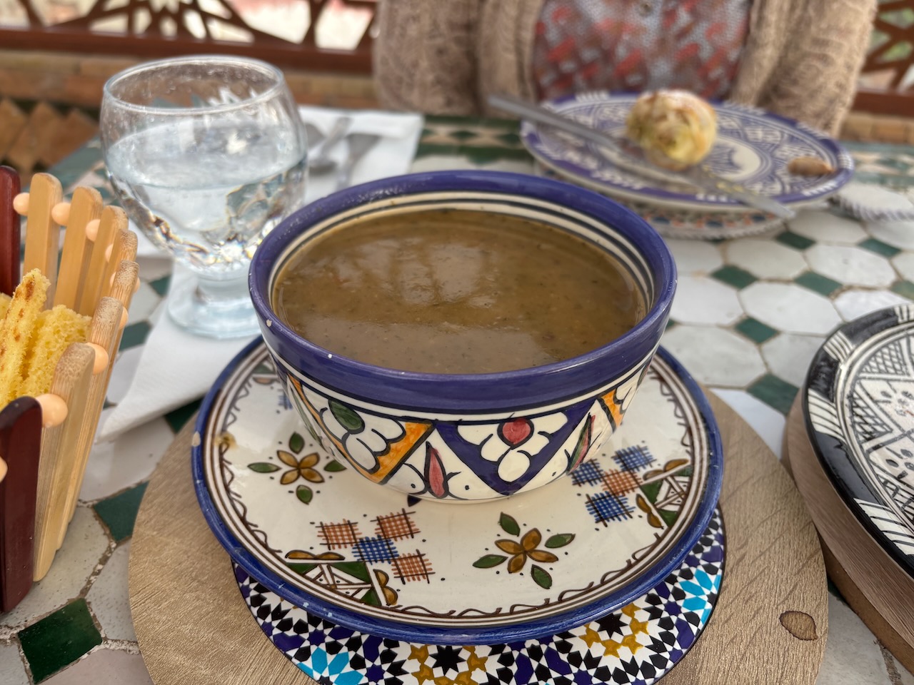 After our long day of exploring, we didn’t have the energy to walk back through the Medina to Le Dhow and so decided to have dinner that night at the Riad. It was served on the roof just like at breakfast and we started with a meat filled puff pastry and Moroccan soup before we split the beef Tagine with Prunes. It was all good, filling and reasonably priced, although I have it listed as 40 Dirhams which doesn’t seem correct. All things being equal though, it was a nice way to end our two nights in Rabat, and it made us eager to get on the road the next day to Tangier, our last stop in Morocco.