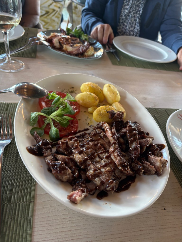 After arriving back at the condo and relaxing a bit, we again walked down to the beach in a different direction than the day before searching for a suitable option for dinner. Our first choice, Pizza Pomodoro, wasn’t yet open and so continuing on we eventually dropped in at Mohana Café. Upon arrival we were seated and quickly ordered a bottle of Martin Codex Alberino, a prelude to one of the better meals of the trip. We dispensed with appetizers and instead ordered an entrée apiece, for Joanna this meant the Scallops with Guacamole, Butter and Lemon and for me the Iberic Sweet Pork Steak with Honey and Mustard. Jessica and Dave would enjoy the scallops and a nicely done order of Pulpo (octopus).