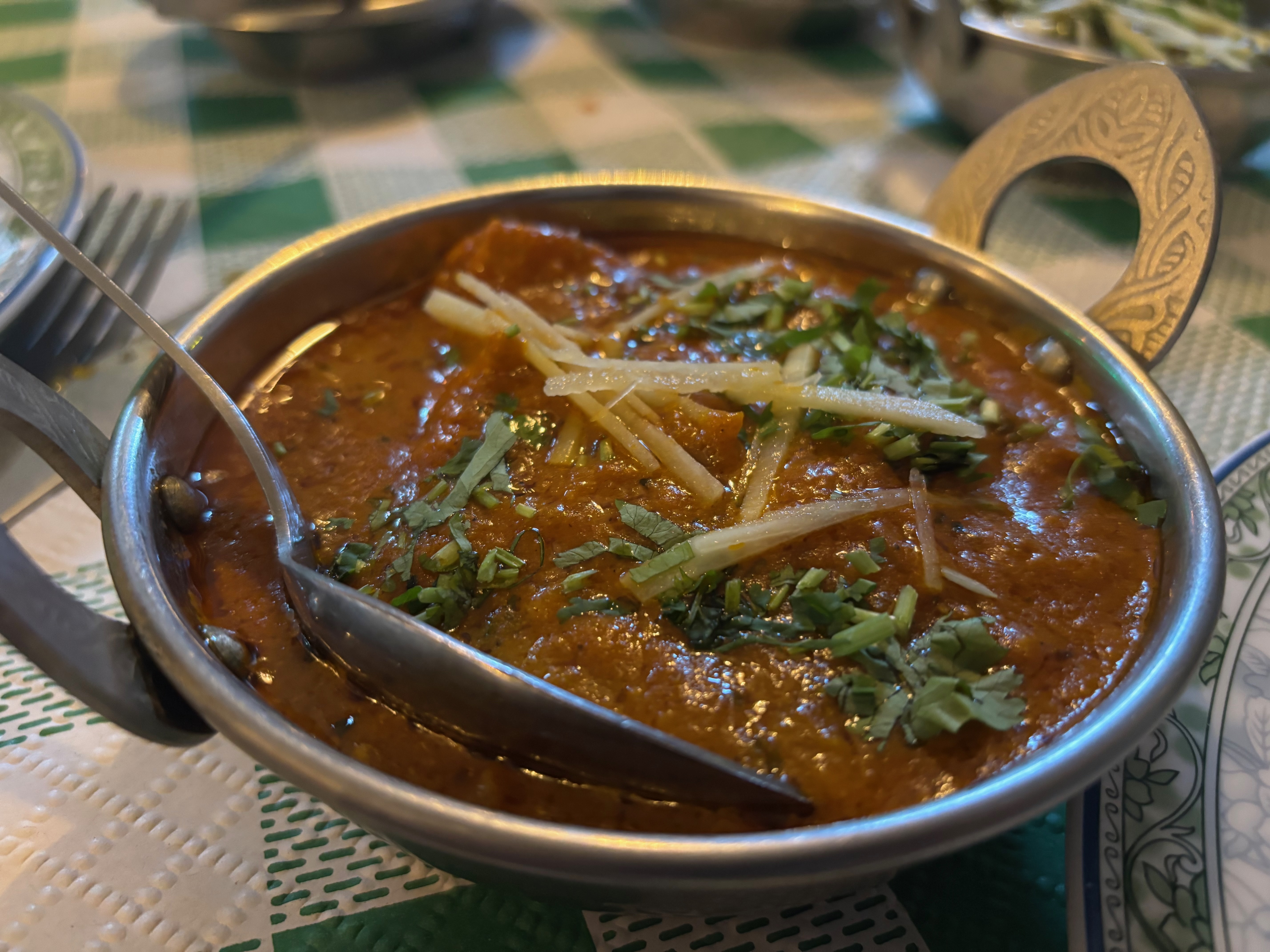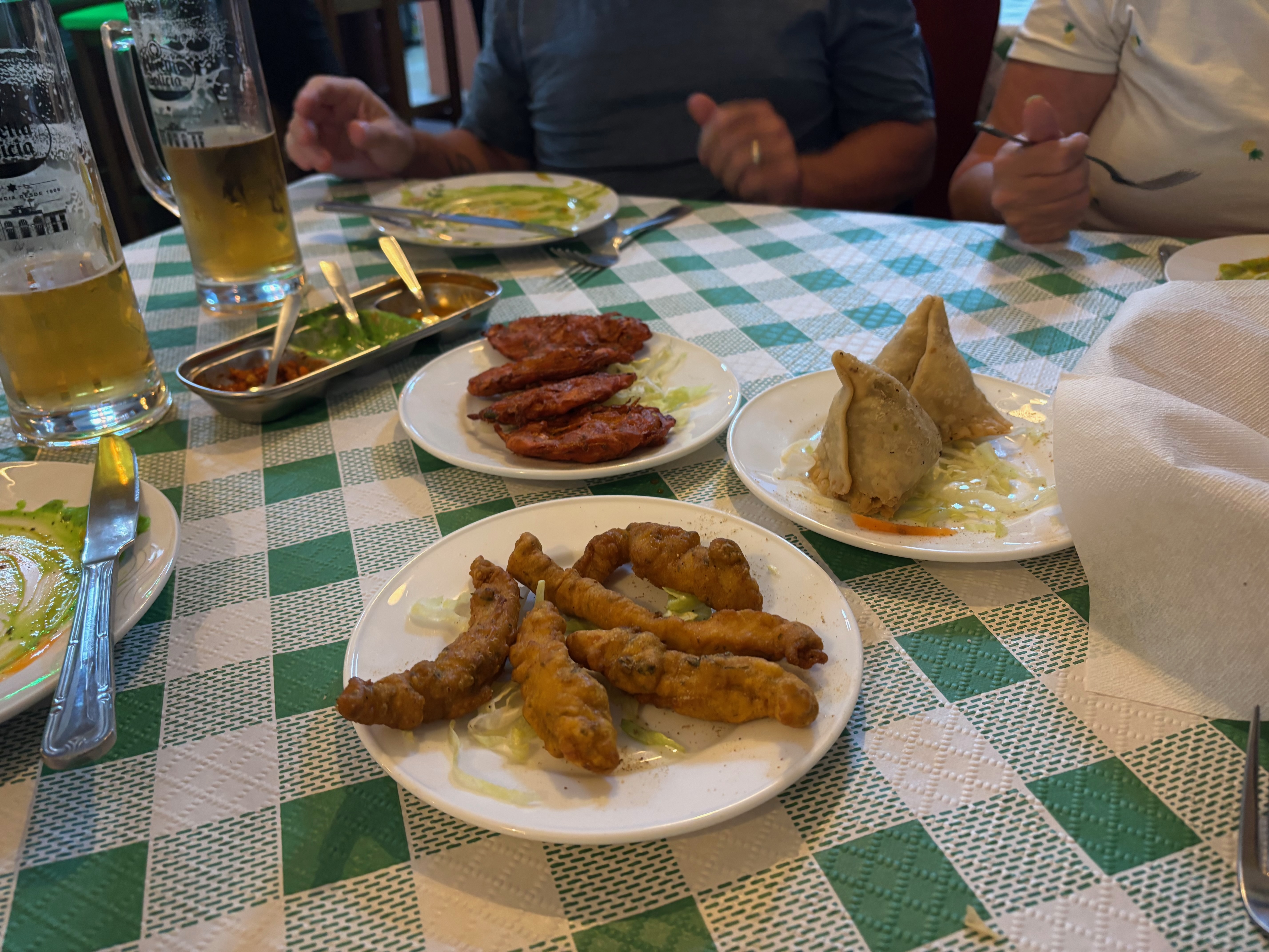We all had a few beers to drink, cold and refreshing which helped us polish off our initial appetizer offerings of Chicken Pakora, Vegetable Samosa, and Onino (Onion/Cebolla) Bhaji, all quite good. Then we all split the Lamb Curry, and Saag Panner (Spinach) with a healthy amount of rice and garlic naan to go along with these very tasty offerings. The tab would come to 62 Euros ($73) for the four of us, yet another satisfying meal that didn’t break the budget.