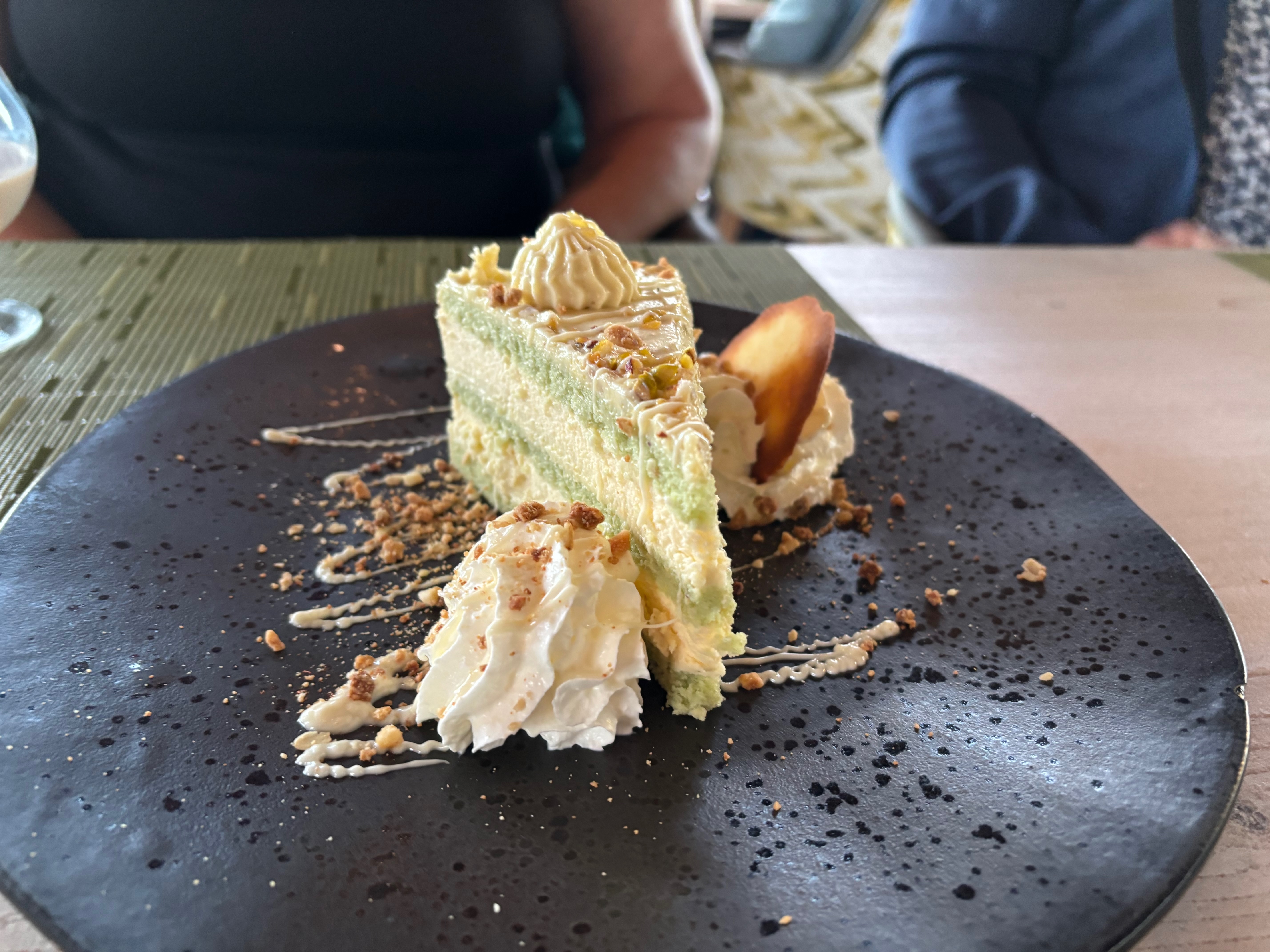 Having demolished the bottle of Alberino, we enjoyed another of the Carramibre Crianza, a nice red that complimented our various offerings. We followed with two superb desserts, the Tarta Pistacho (Pistachio and Lemon Cake) and Tarta de Dulce de Leche (Dulce de Leche cake with coconut ice cream). The best thing about all of it was the final tab, just 133 Euros ($154) for the four of us, inexpensive when you consider it included two bottles of wine and two plates of scallops.