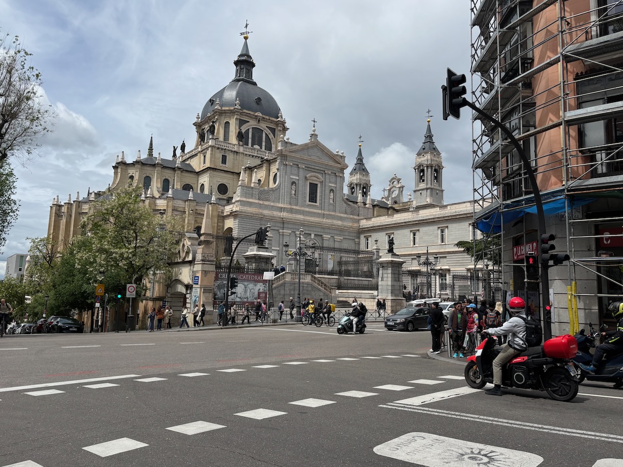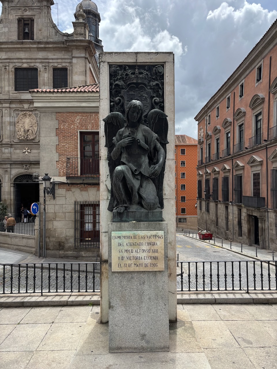 On the way to the Almudena Cathedral, we stopped briefly to take in the Assassination Attempt Memorial which memorializes the 1906 assassination attempt on Spain’s King Alfonso XIII and his bride, Victoria Eugenie, as they paraded by on their wedding day. While the crowd was throwing flowers, an anarchist threw a bouquet lashed to a bomb from a balcony at #84 (across the street). It missed the royal newlyweds but killed 28 people. The king and queen went on to live to a ripe old age, producing many great-grandchildren, including the current king, Felipe VI.