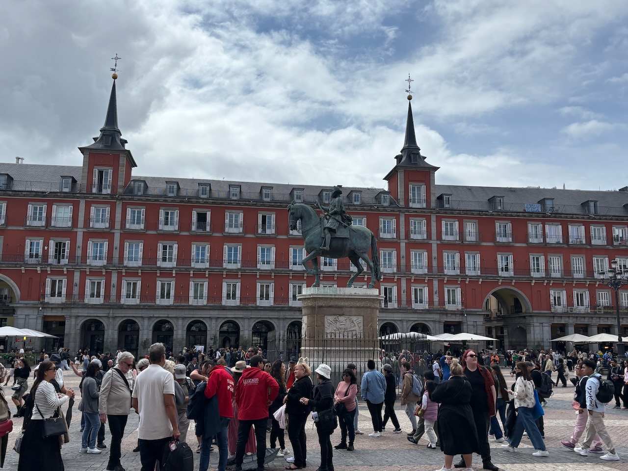 After leaving La Mallorquina, we walked a short distance to Plaza Mayor, which dates to Madrid’s glory days, the 1600s. Back then, this, not Puerta del Sol, was Madrid’s main square. The equestrian statue (wearing a ruffled collar) honors Philip III, who made this square the centerpiece of the budding capital in 1619. Philip’s dad (Philip II) made Madrid the country’s capital and the son transformed a former marketplace into this state-of-the-art Baroque plaza. The square is enclosed by four-story buildings with symmetrical windows, balconies, slate roofs, and steepled towers. Each side of the square is uniform, as if a grand palace were turned inside-out. This distinct look, pioneered by architect Juan de Herrera (who finished El Escorial), is found all over Madrid.