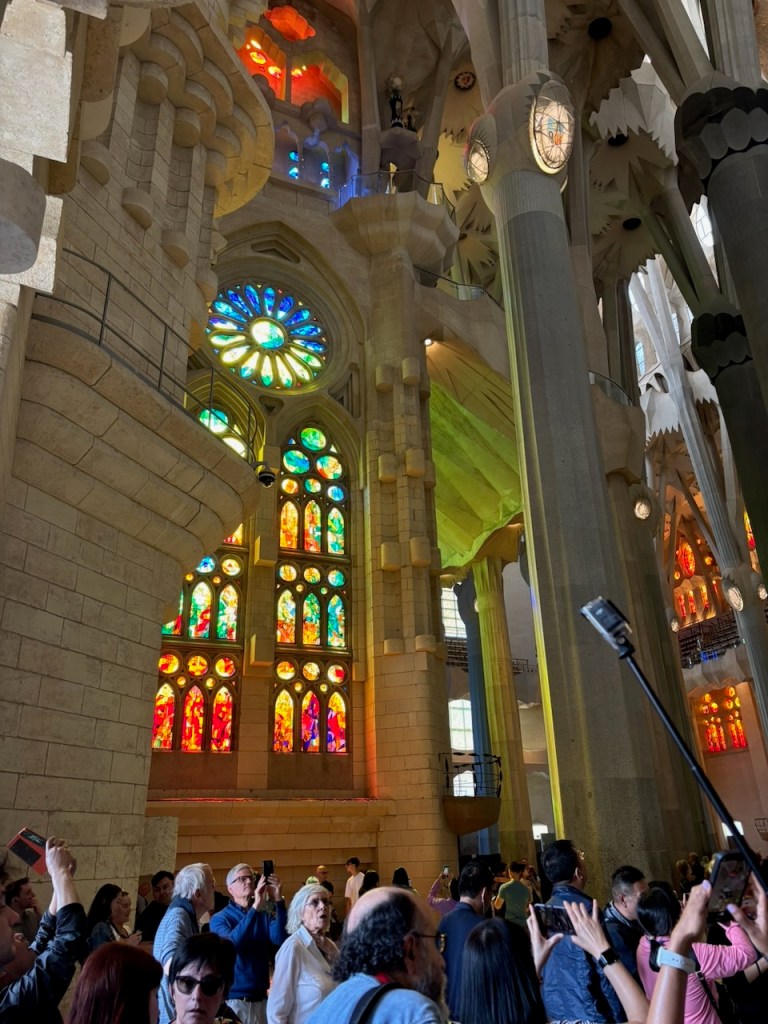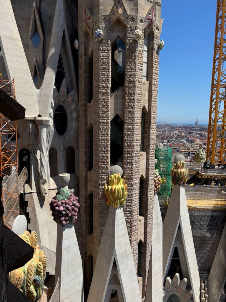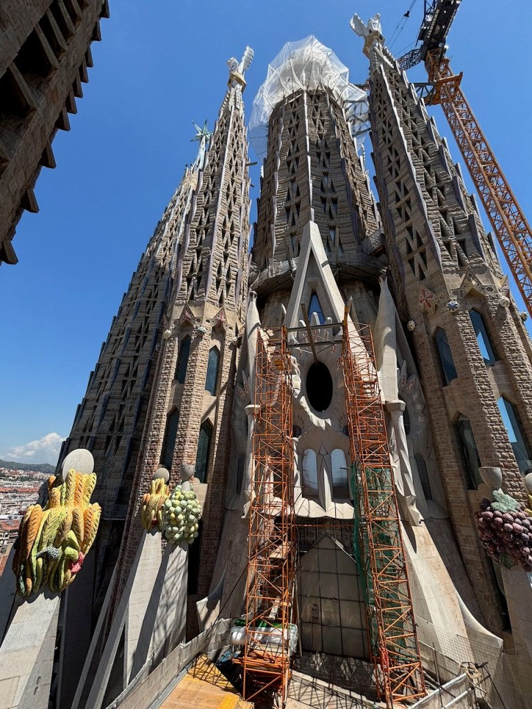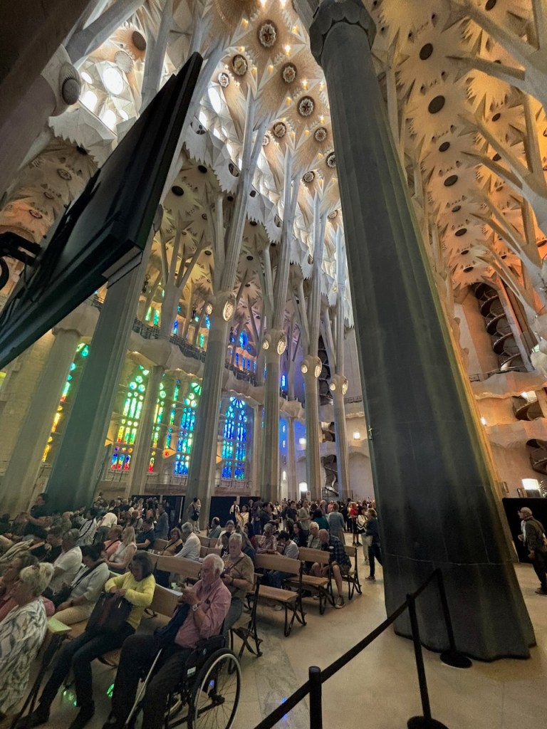 Since then, construction has continued but was interrupted by the Spanish Civil War and its aftermath (1936-1950’s) and the Covid pandemic. Strides have been made and it is predicted to be almost totally completed in 2026. We purchased a guided tour in advance to eliminate standing in line which worked well in that regard, but once inside on tour it proved frustrating as it was difficult to understand the guide due to her accent and the quality of the remote headsets we were issued, exacerbated by the crowded conditions inside the building.