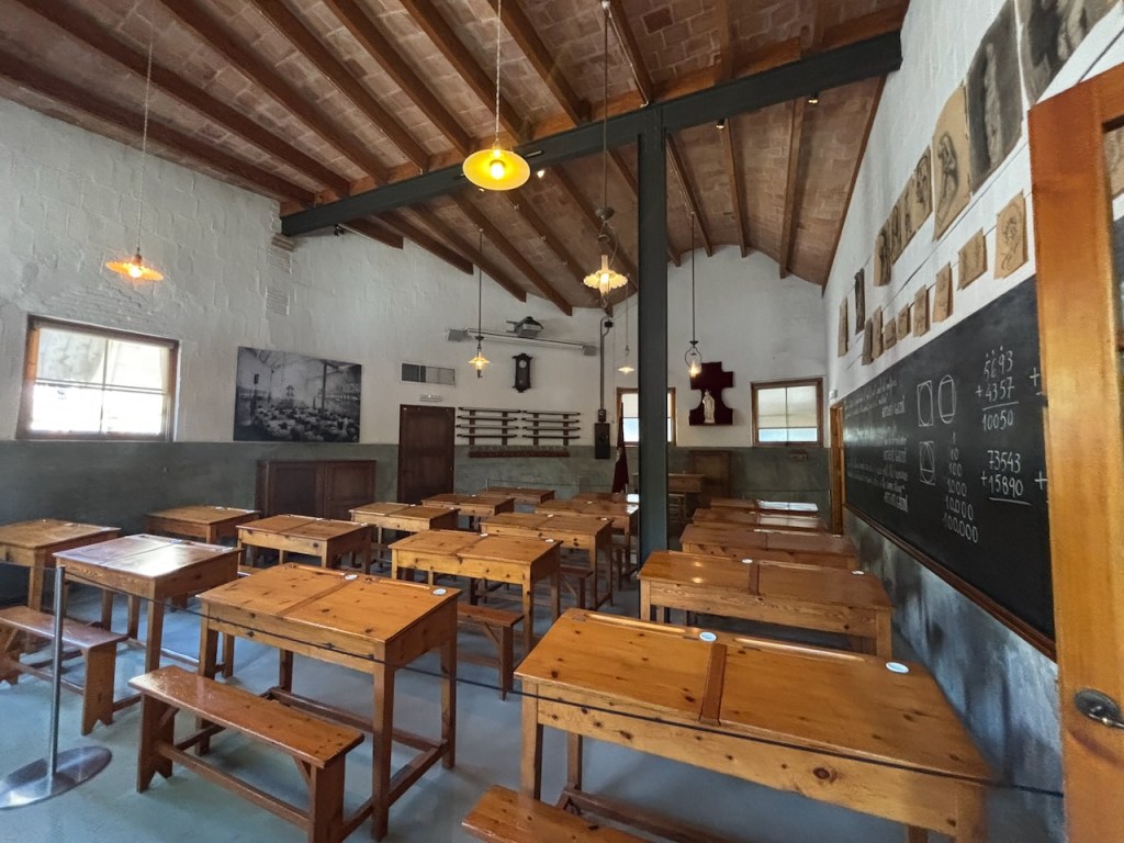When our tour finished, I went outside, pausing to admire the bronze doors created by Josep M. Subirachs, a Barcelona born sculptor and painter of the late 20th century who is best known for his work on the Passion Facade where the doors are located. While waiting for the others to finish, I explored a schoolroom on the perimeter of the Basilica, designed by Gaudi as a temporary school for the sons and daughters of the workers of the church and the local children.