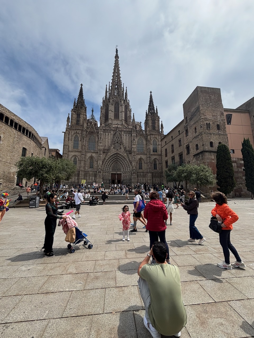 We continued down Carrer del Bisbe through the Jewish Quarter until we reached Pla de la Seu, the square in front of Barcelona’s Cathedral, formally known as the Cathedral of the Holy Cross and Saint Eulalia. This has been Barcelona’s holiest spot for 2,000 years. The Romans built their temple of Jupiter here and in AD 343, that pagan temple was replaced by a Christian cathedral. Around the year 1000, that building was replaced again, this time by a Romanesque-style church. The current Gothic structurewas constructed from the thirteenth to fifteenth centuries, with the principal work done in the fourteenth century. The cloister, which encloses the Well of the Geese, was completed in 1448. In the late nineteenth century, the neo-Gothic façade was constructed over the undistinguished exterior that was common to Catalan churches.