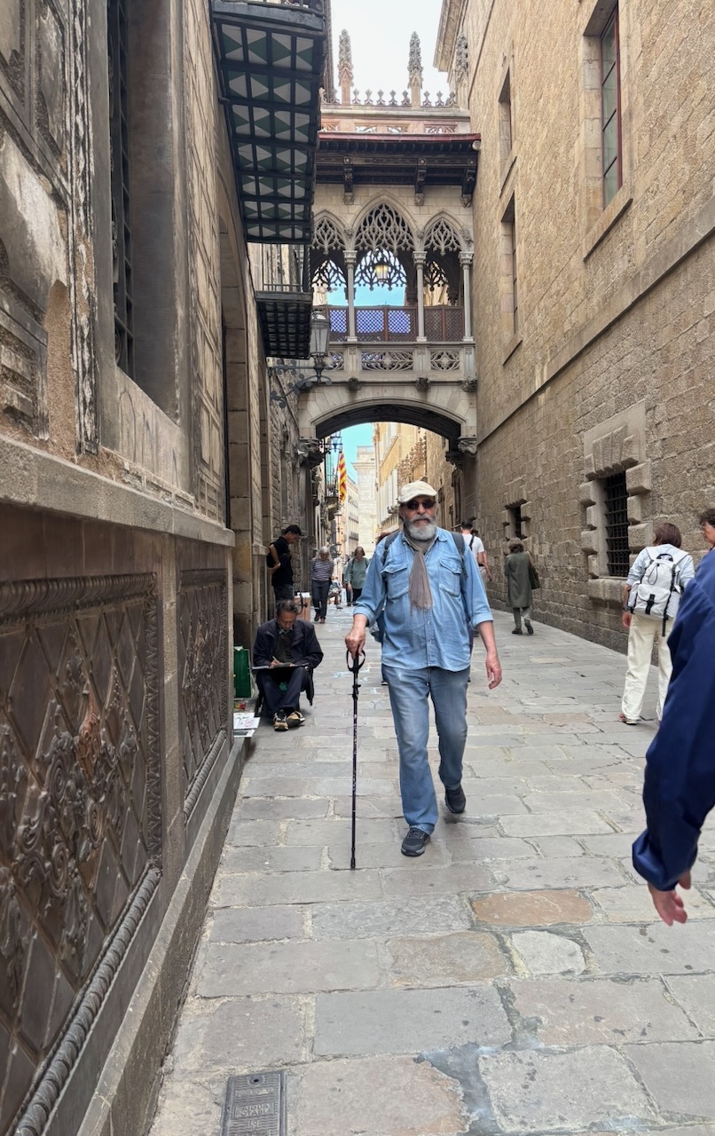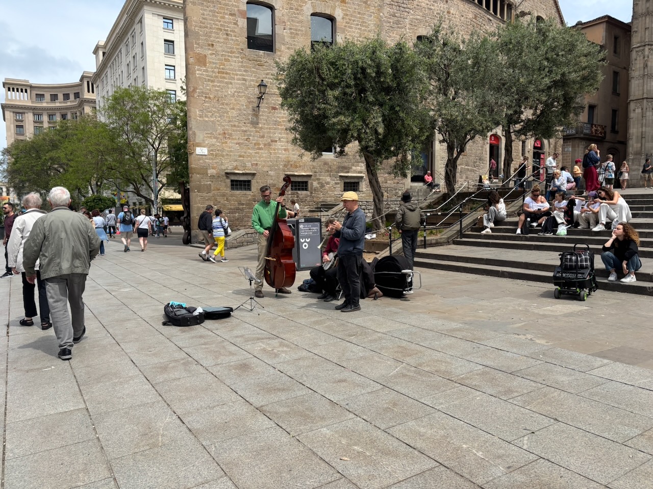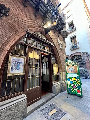 We opted not to tour the cathedral, instead enjoying for the moment a group of street musicians, a common sight in the square. I recall when we visited here, either in 2014 or 2017 that a sizable market operated, featuring all kinds of merchandise, from junk to antiques to inexpensive clothing. We left the square and feeling peckish, walked to Els Quatre Gats (the Four Cats). This restaurant (at #3) is a historic monument, tourist attraction, nightspot, and recommended eatery. It’s famous for being the circa-1900 bohemian-artist hangout where Picasso nursed drinks with friends and had his first one-man show. The building itself, by prominent architect Josep Puig i Cadafalch, represents Neo-Gothic Modernisme.