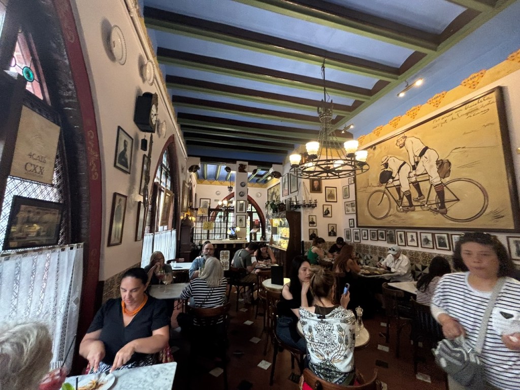 Rich Barcelona elites and would-be avant-garde artists looked to Paris (not Madrid) for cultural inspiration. This place was clearly influenced by Paris’ Le Chat Noir, a cabaret/café and the hangout of Montmartre intellectuals. Like Le Chat Noir, Els Quatre Gats even published its own artsy magazine for a while. The story of the name? When the proprietor told his friends that he’d stay open 24 hours a day, they said, “No one will come.” Using a popular Catalan phrase, they told him, “It’ll just be you and four cats.” When we arrived, it was quite crowded in the entry dining room, with more space in a larger adjacent room, but we chose to sit at the one vacant table and enjoyed a round of drinks.