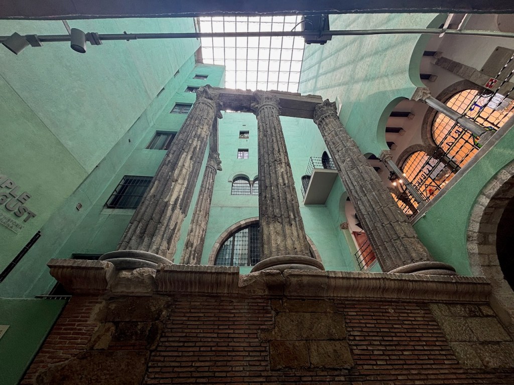 Our next stop was the Temple of Augustus in Barcelon, a Roman temple built during the Imperial period in what was then the colony of Barcino. The temple was the central building on Tàber Hill, and it currently is housed in Carrer del Paradís number 10. All that’s left are four columns and some fragments of the transept and its plinth. The huge columns, dating from the late first century BC, were part of the ancient town’s biggest structure, dedicated to Augustus, who was worshipped as a god. These Corinthian columns (with deep fluting and topped with leafy capitals) were the back corner of a 120-foot-long temple that extended from here to Barcino’s forum (Plaça de Sant Jaume).