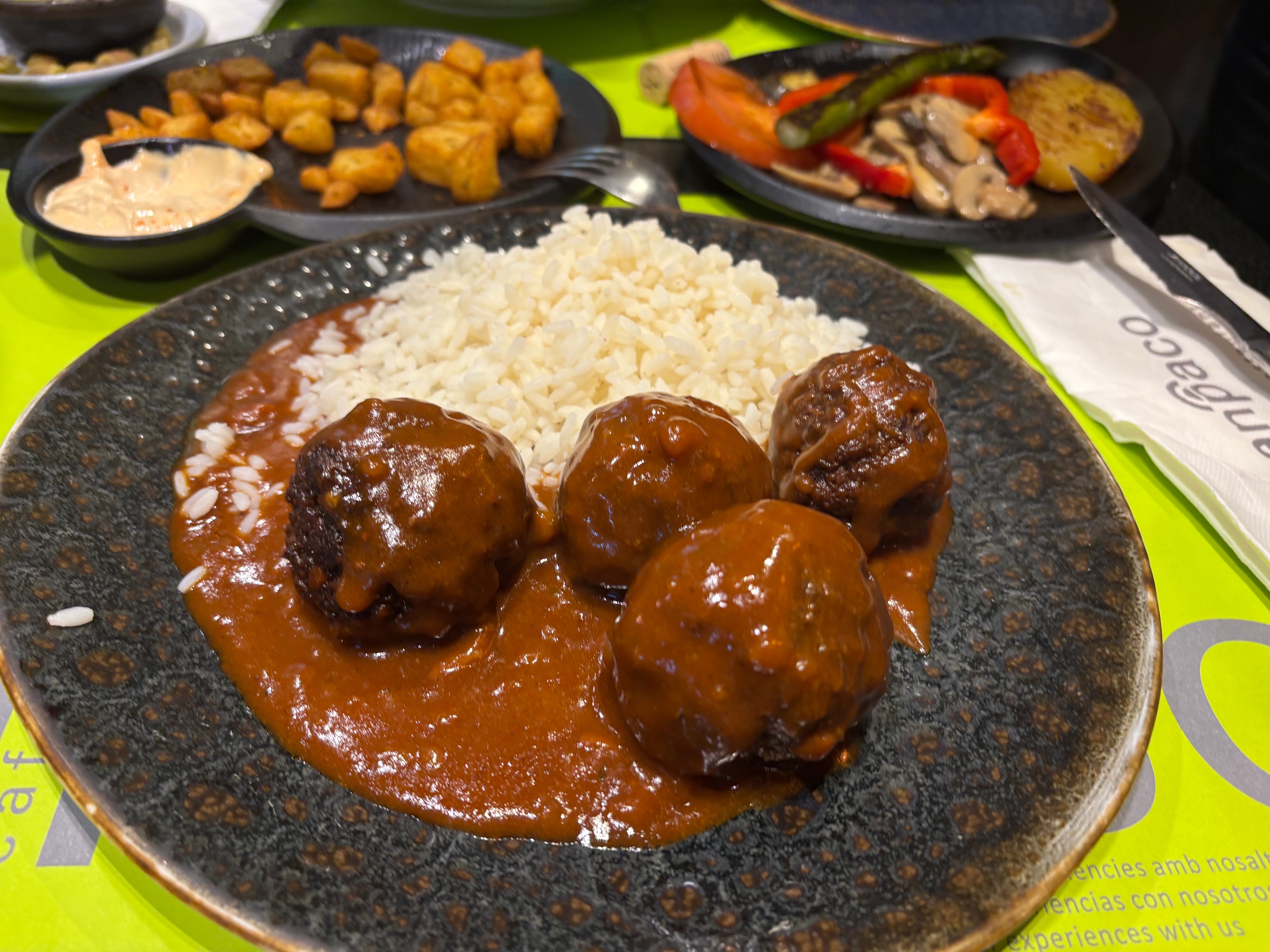 We started with Melon with Iberian ham, a gigantic serving which was followed by a bowl of the Gazpacho Andaluz (Andalusian gazpacho cold soup with croutons). Next up was a large serving of Patatas Bravas (with spicey sauce) and a side order of sauteed Assorted Vegetables (Verduras). To close out the meal Joanna had the Mussels in white wine sauce while I worked my way through a portion of the Albondigas en Salsa (Meatballs with sauce and rice).