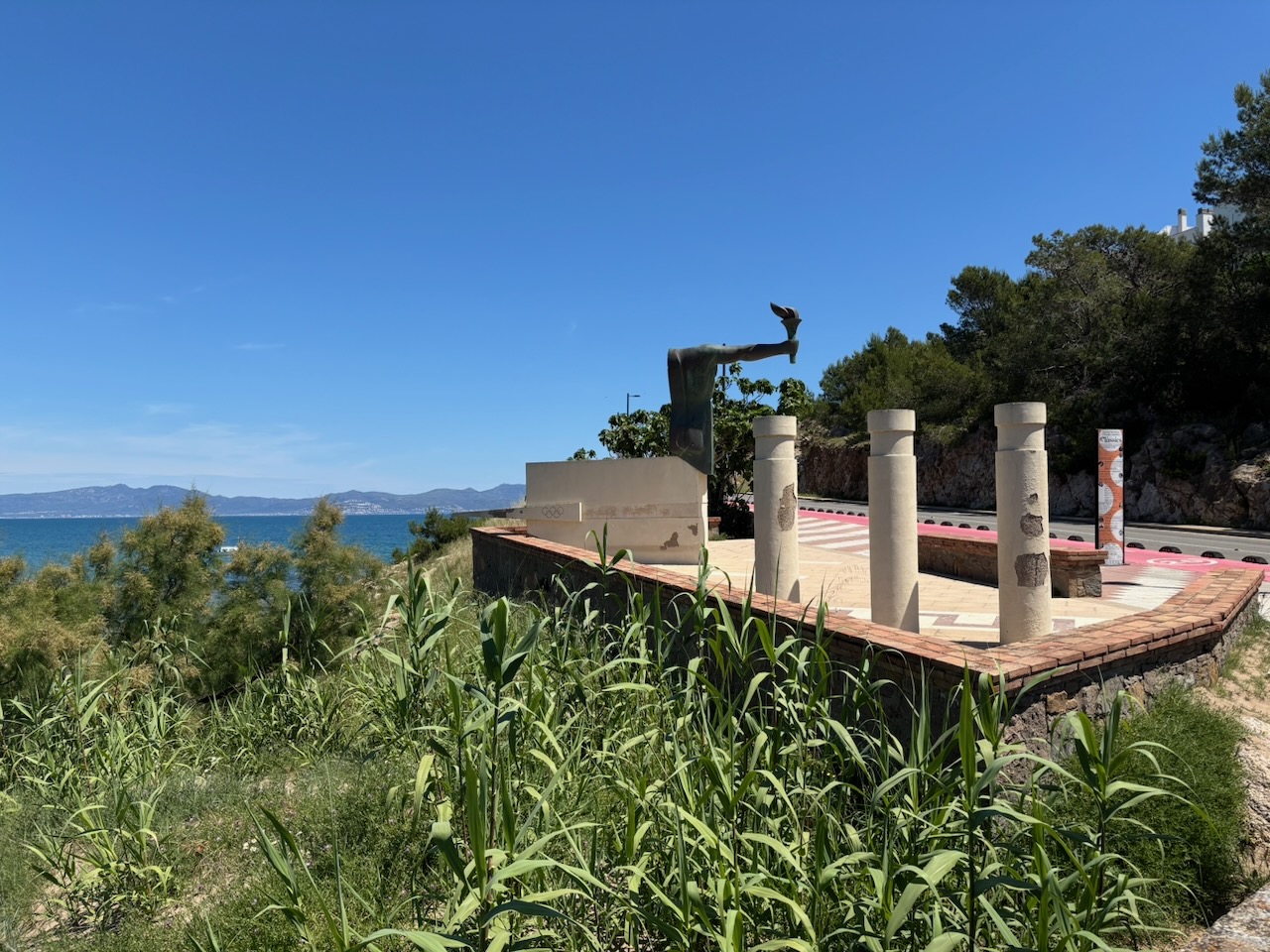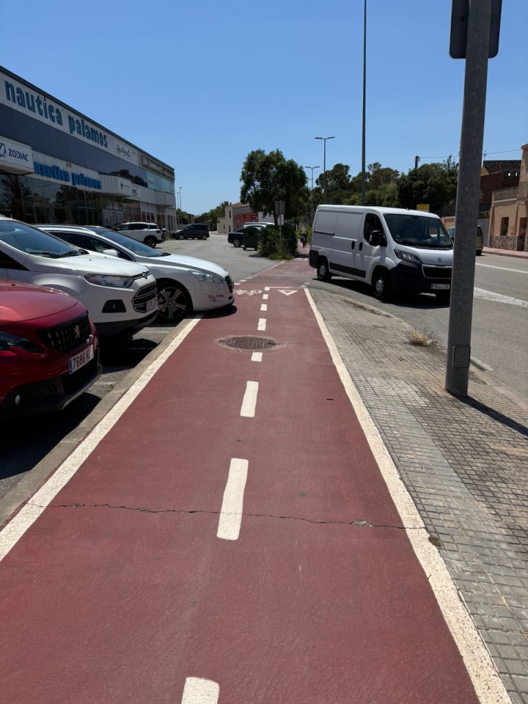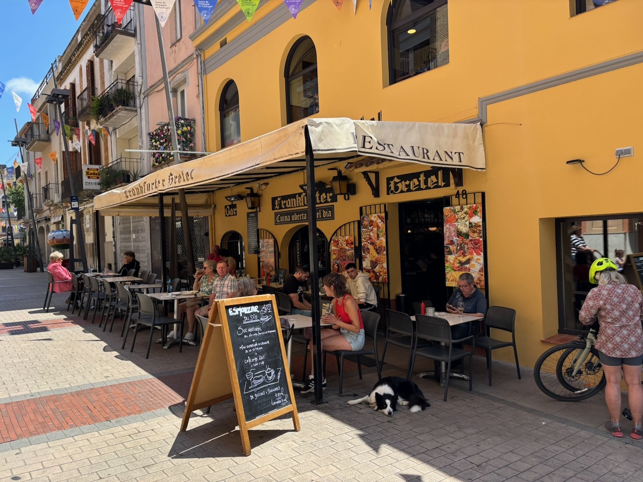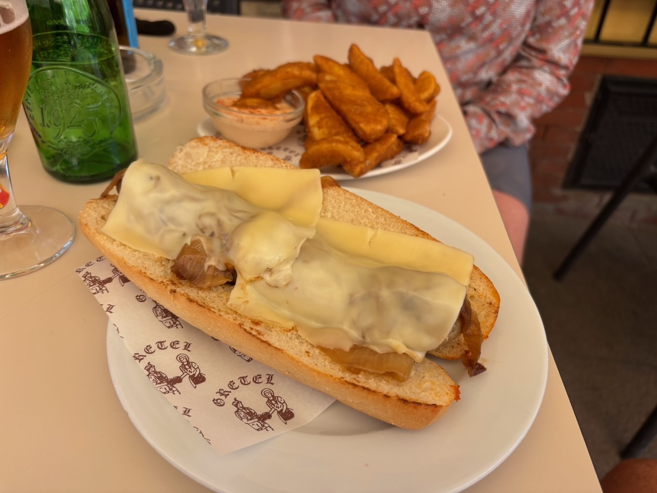 As with the day before, we used Google maps and paused midway in the small town of Pals, climbing up some steep hills to get to its center, then a little further on, with about thirteen easy miles to go, stopped again in the town of Palafrugells for lunch at Frankfurter Gretel. We sat outside under an awning and split a bratwurst with melted cheese, an order of Patatas Bravas and quickly consumed a beer apiece, for a total tab of 17 Euros ($18.60).