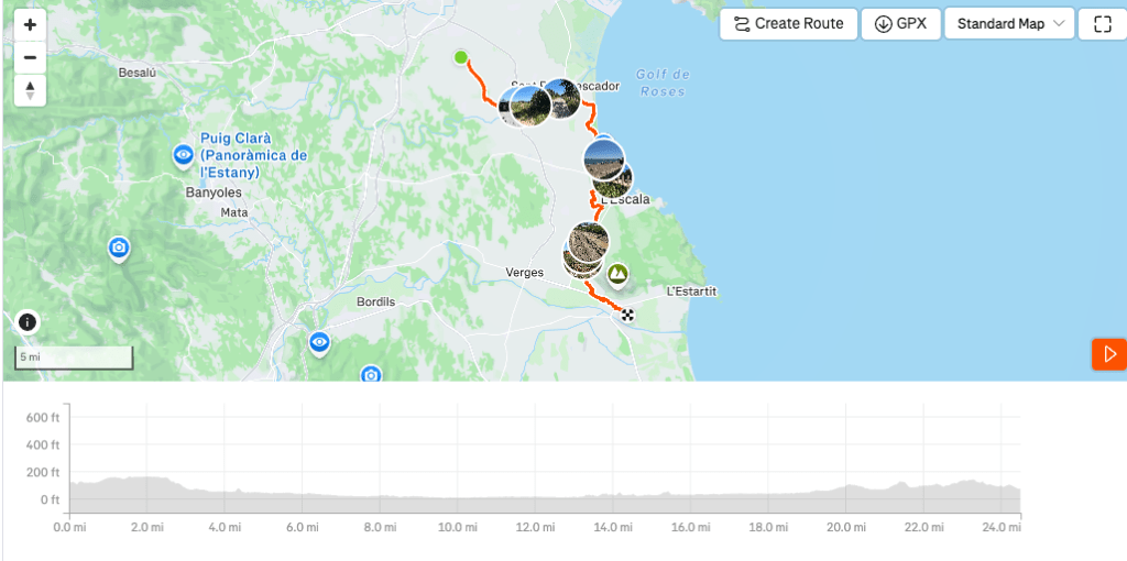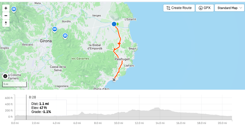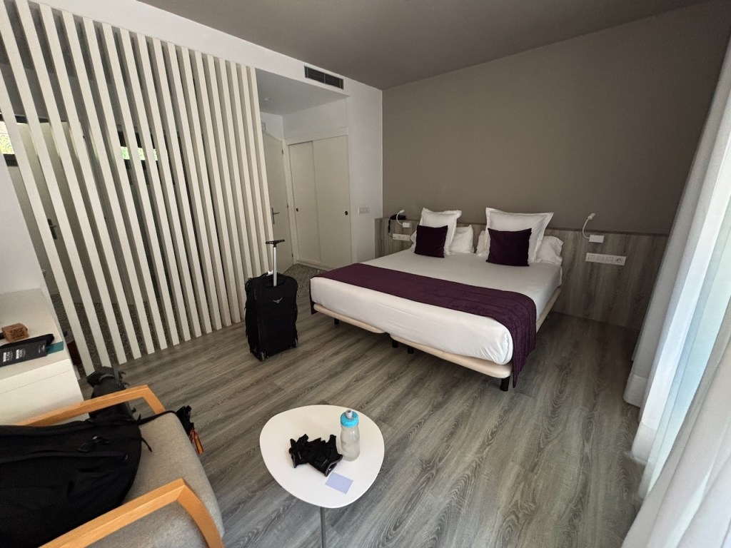 We would finish the day with 25 miles of riding and 636 feet of climbing and were delighted when we pulled into Moli Del Mig in Torroella de Montgri a 15th century mill restored by the architect Josep M. Deulofeu. Our room would be in a new addition to the hotel, a series of modern individual rooms a short distance from the main building. And, as with all the other places we had stayed at so far, this nice accommodation was reasonably priced, likely between $120 to $200 a night depending on the time of year.