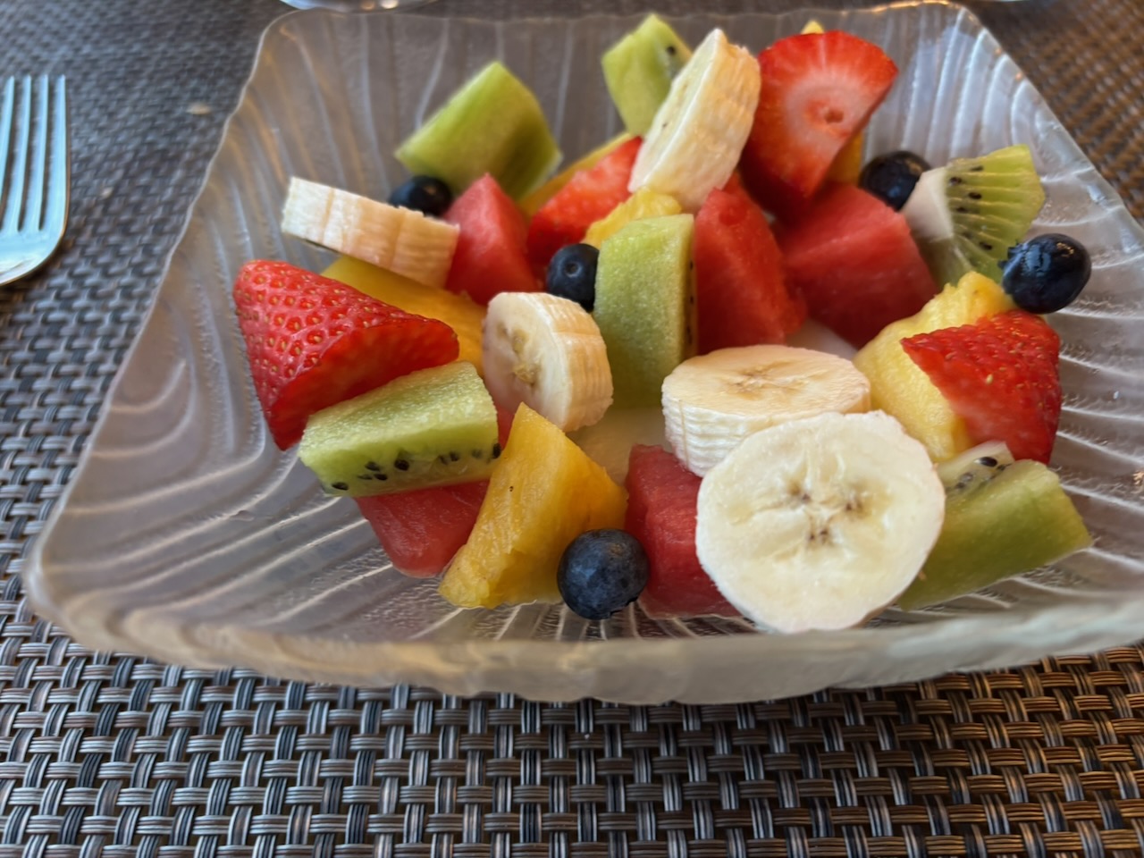 For entrees I would enjoy roast pork tenderloin and for Joanna, the, well, we can’t remember and the picture below is of absolutely no help whatsoever. But she ate all of it so it must have been good. Dessert was simple, a nice fruit salad for both of us.