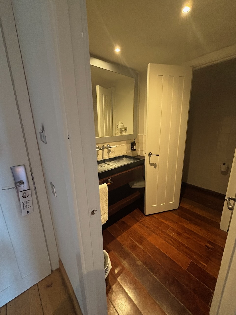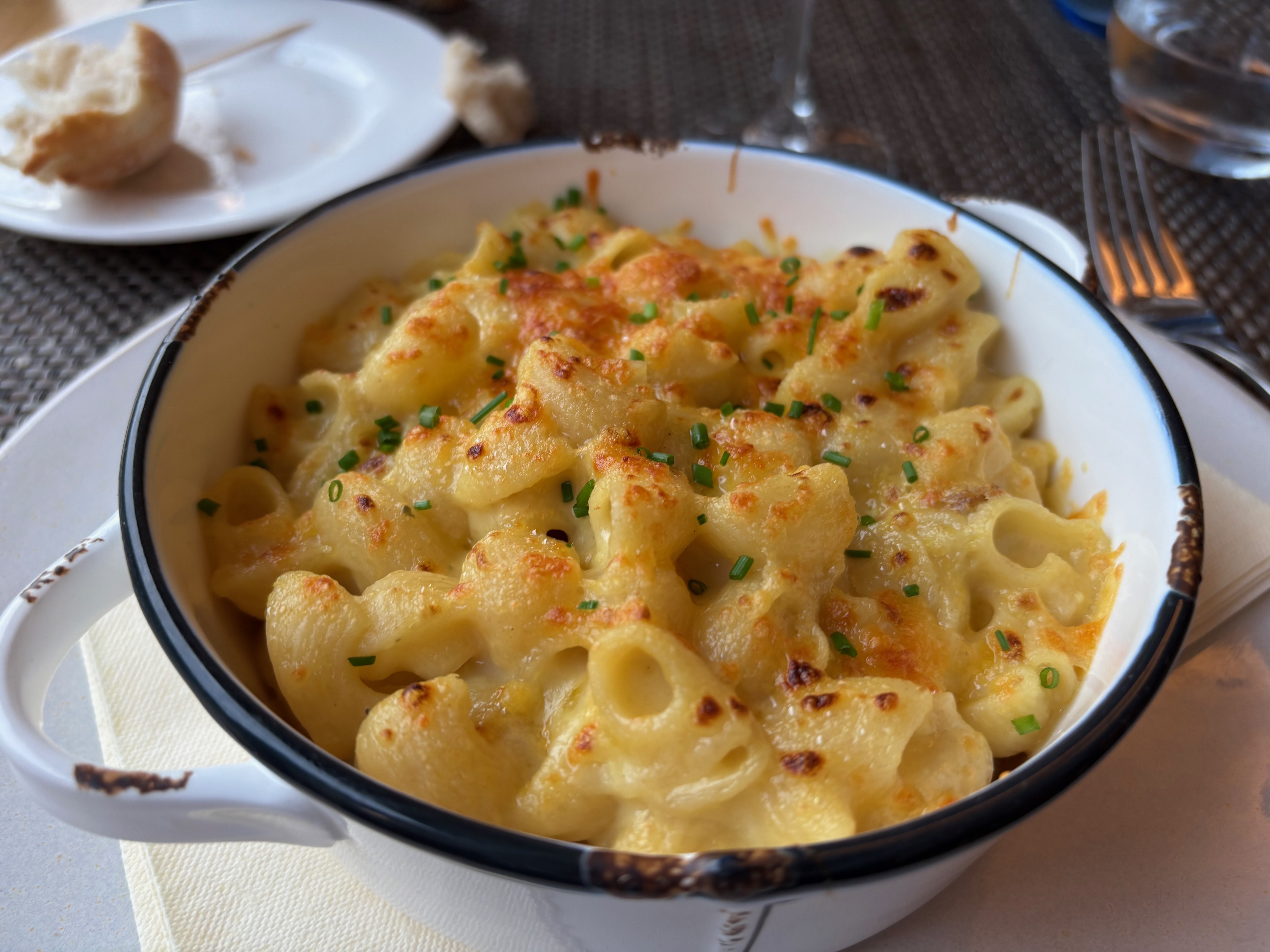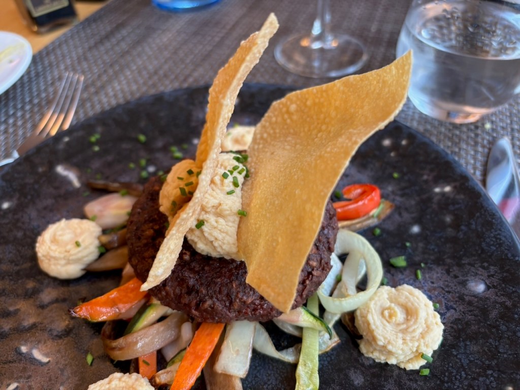 While Joanna spent some time relaxing in the small patio of our room before dinner, I made my way to the hotel bar to enjoy a glass of a local white wine. She soon joined me and we sat for our last evening meal of the tour and again weren’t disappointed. We ordered a bottle of Pinot Noir and began with our starters, a salad for Joanna and a Macaroni and Cheese dish for me.