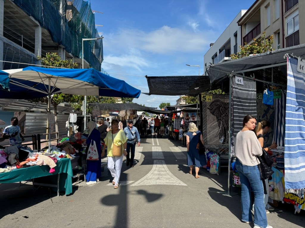 The next morning, we enjoyed the hearty buffet breakfast provided with our room and then set out for the weekly multi block street market behind the hotel, which was full of lots of clothing, accessories, and other miscellaneous items for sale, but not much in the way of produce and fruit. Quite crowded that day, we strolled leisurely for an hour or two, finally splitting off to grab a snack at Casa Moner where we thoroughly enjoyed a piece of cake and two café con leche’s for a total of 8.20 Euros ($9.27).